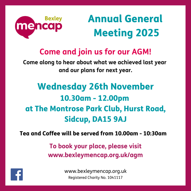 We are delighted to invite you to the Bexley Mencap AGM on Wednesday 26th November from 10.30am-12.00pm. (Tea and coffee from 10am)